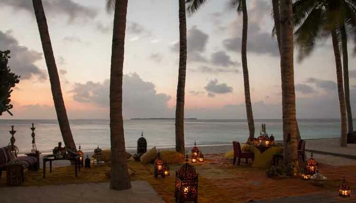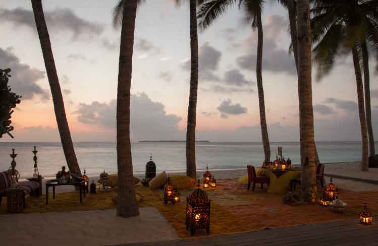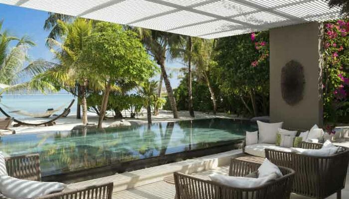 In the rare gardens, plush ottomans and chairs invite guests to immerse in Maldivian serenity.