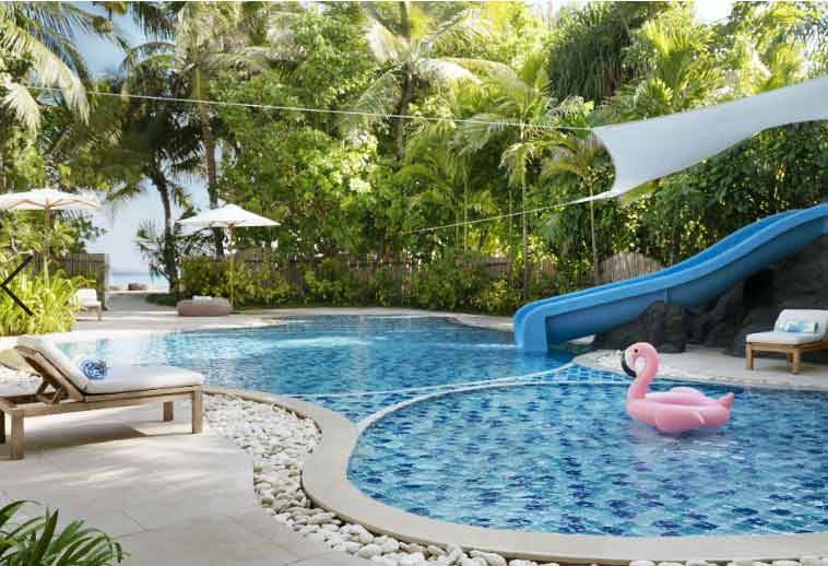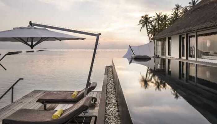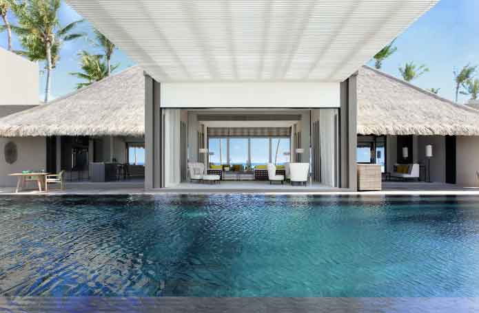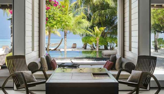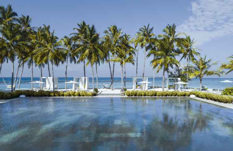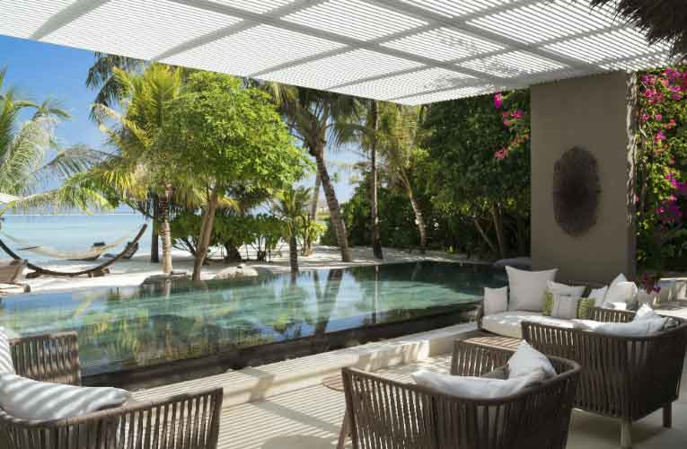 Outside, a jungle of palm trees and exotic plants shade the infinity pool and ivory sand beach. A garden pavilion and plush armchairs invite discerning travellers to moments of residential relaxation.