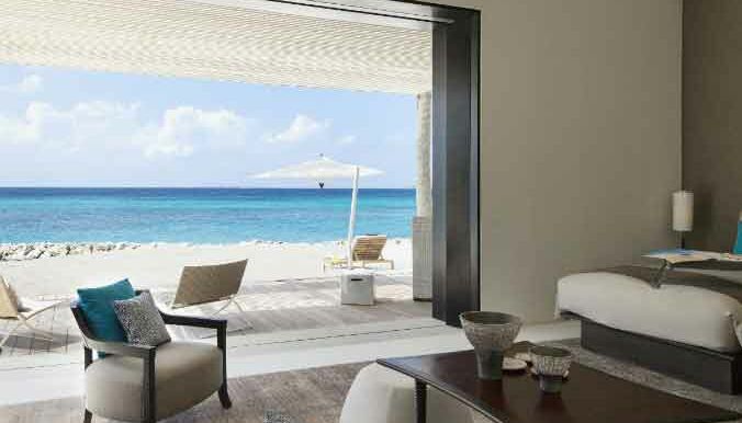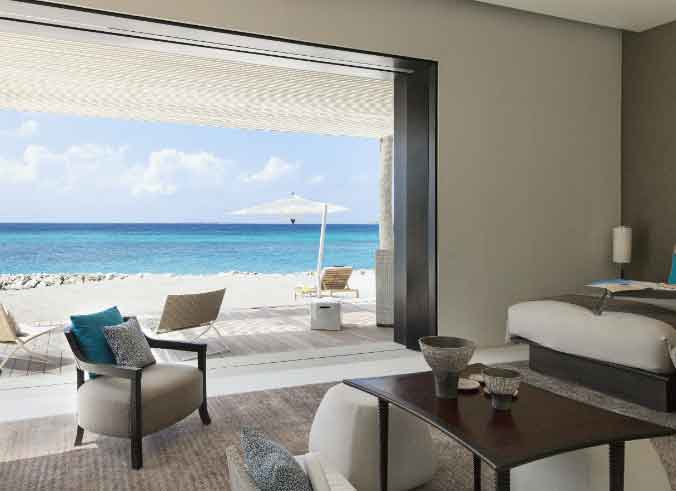 Opening onto both lush gardens and the crystal ocean, this rare dual-personality villa experience offers a spacious living room, powder room, master bedroom with a double dressing room, bathroom with indoor and outdoor rain showers, a bathtub and separate toilet.