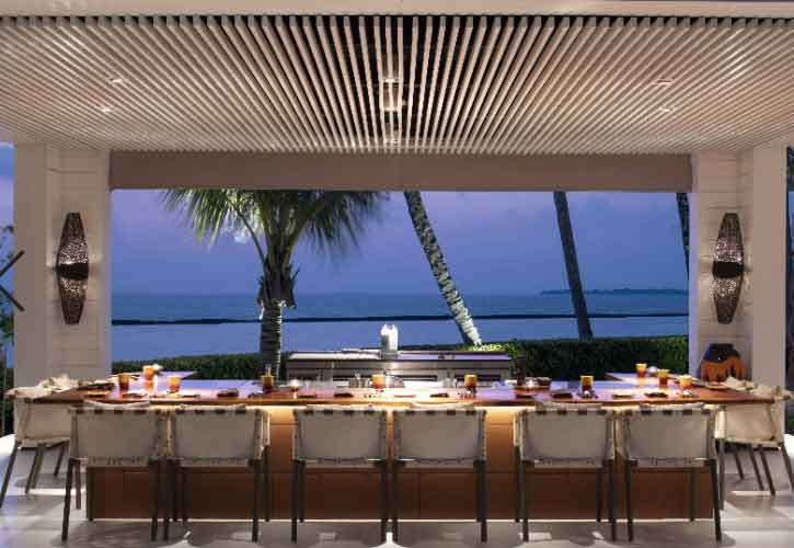 On the garden side, a dining area is the perfect place for tropical relaxation, feet in the sand, exuding an unprecedented experience of relaxation.