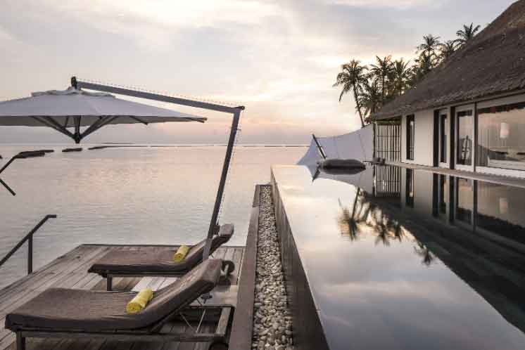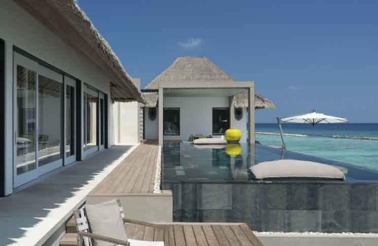 On the lagoon side, overwater decks feature a dining pergola, lounge area, private 12.5-metre-long infinity pool, rain shower and direct access to the blue lagoon.