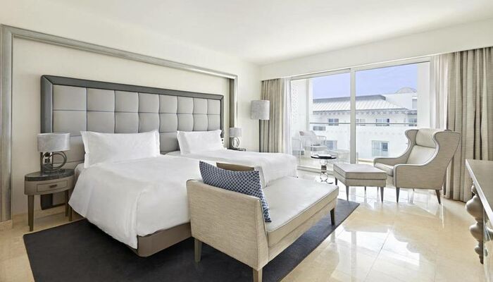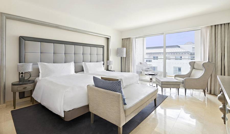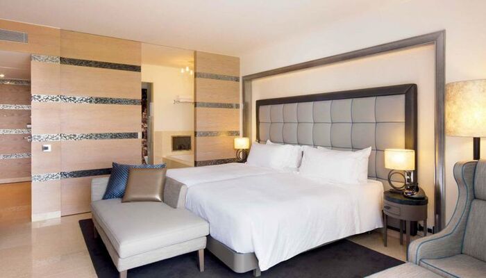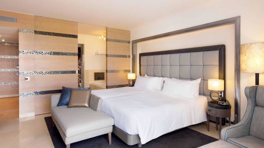 The Deluxe Twin rooms feature two twin beds within 38 m2 of contemporary luxury. Each Deluxe Twin Pool View room also has a private and spacious balcony with views over the destination’s swimming pool area. Additional features include a 42” HD flat screen TV, in-room entertainment and media centre, DVD player, MP3 sound system, WIFI, security safe, two telephones, individual temperature control, a fully stocked in-room bar and a Nespresso coffee machine. Each Deluxe Twin bathroom has a separate bathtub with a built in TV, or if you prefer to shower, a rain shower set in marble, and offers soft cotton bathrobes and slippers