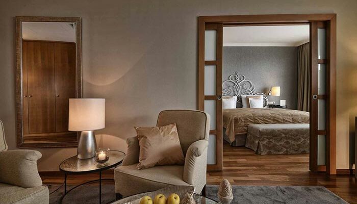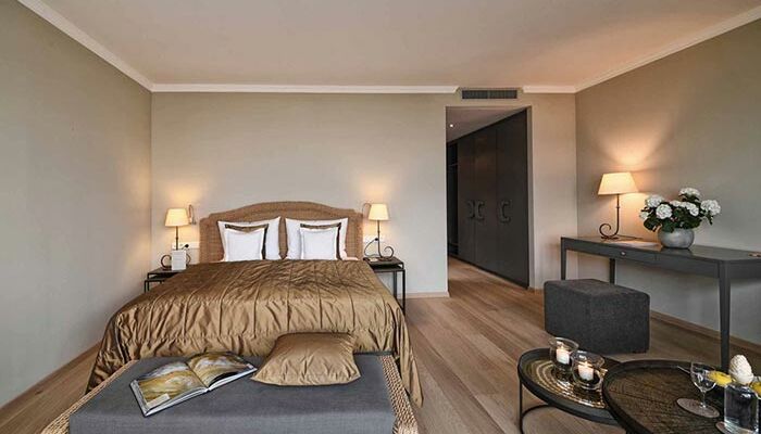 for 2 persons | 45m2, Suite with separate bedroom and living areas, balcony with view of the garden, bathroom, WC, partial wood flooring, two satellite TVs, wifi, radio, phone, minibar and safe.