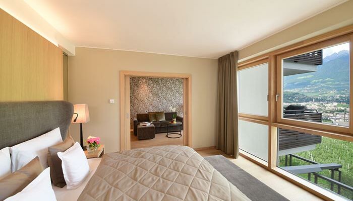 for 2 persons | 50m2, Suite with separate bedroom and living areas, balcony with view of Merano and Tirolo, shower, separate WC, wood flooring, two satellite TVs, wifi, phone, minibar, safe and air conditioning.