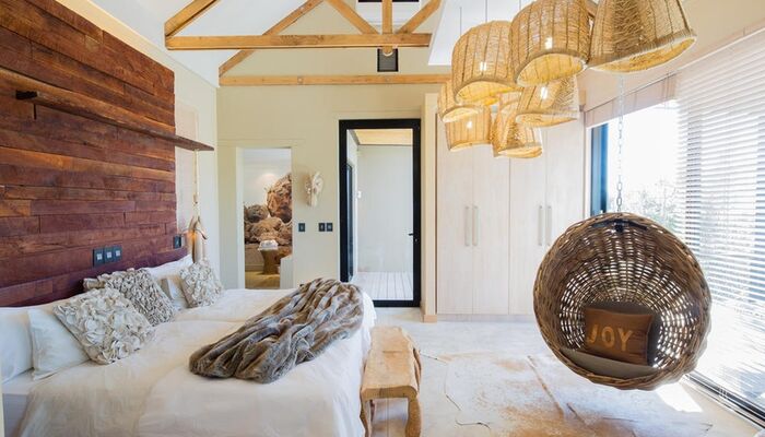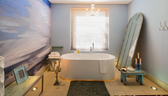 The en-suite bathroom separates into a large walk-in shower plus a toilet. Double basins are mounted on marble bench-tops with an overhanging mirror. A deep free-standing bath is positioned to enjoy the outside views, and an eco-friendly range of body products, fluffy towels, candles and under-floor heating complete the amenities.