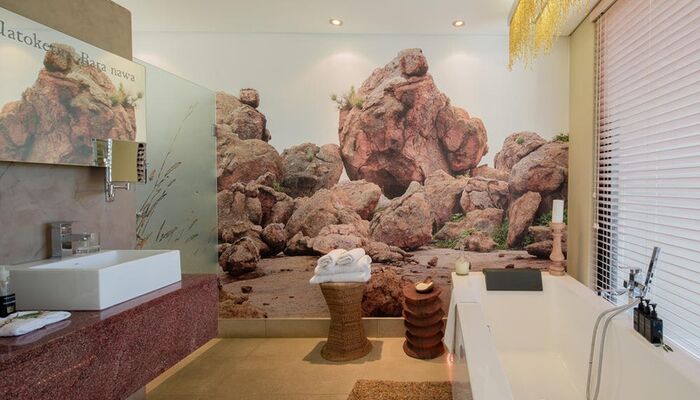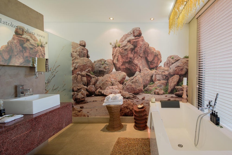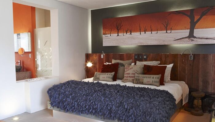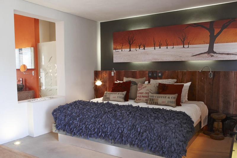 Each suite at Olive Exclusive is individually themed around a region of Namibia: Caprivi, Etosha, Erongo and Kunene. Descriptive photographs and natural elements unique to each area are matched with complementary linen, furniture and fittings. Well-placed and easily adjustable lighting adds to the relaxing ambience.