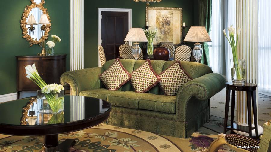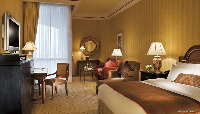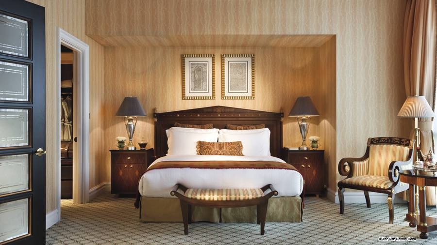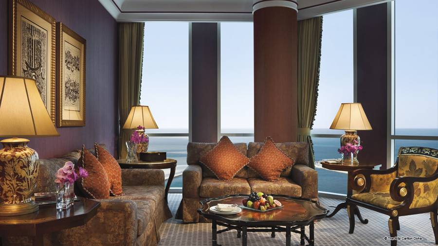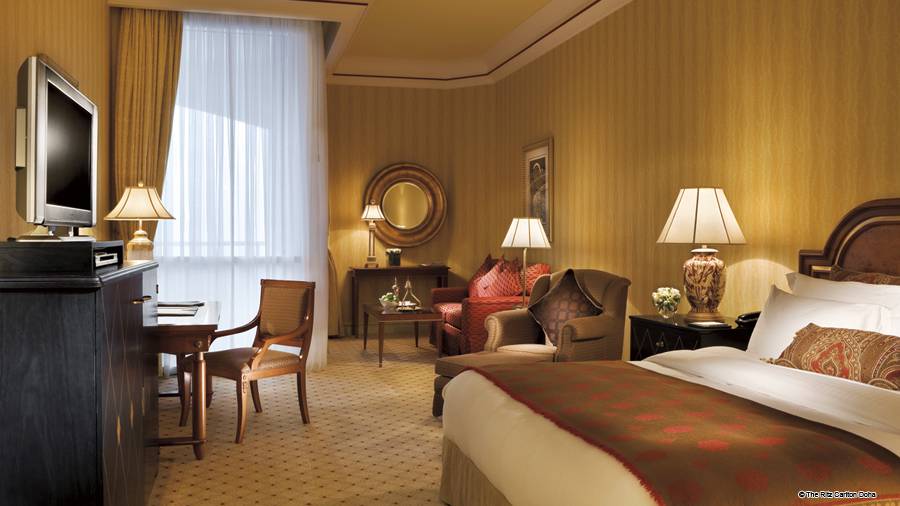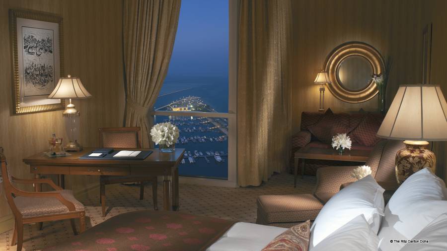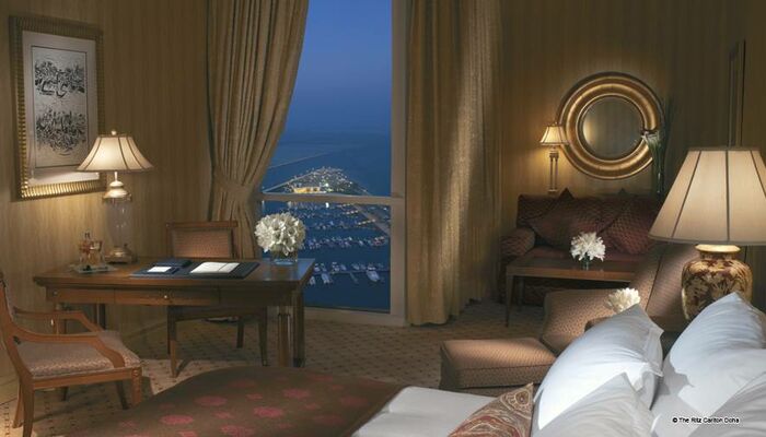 The Ritz-Carlton, Doha offers 374 guest rooms including 61 suites and 42 Club Level rooms. All guest rooms offer breathtaking views of the Gulf or Doha cityscape, have private balconies and a wealth of premium amenities. All guestrooms and suites reflect the Middle Eastern appreciation for brightly-hued colours and contemporary style. Furnishings, hand crafted in Spain and Italy, include sea blue armoires with inlays of yellow and gold leaf. Headboards are distinguished by rich gold leaf and shades of crimson red. Carpets are Kaleidoscopes of color and patterns. Black and white calligraphy works of art hang on the walls.