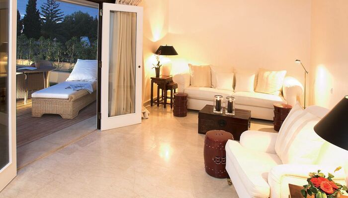 Suite No. 7 is on the ground floor and has a private terrace with sun loungers. The spacious bathroom has a double sink, tub and double shower. The living room has a large sofa and is providing a home from home feeling. Other features include a high-definition flat-screen TV, MP3 sound system, WIFI, safe, telephone, and individual air conditioning. Deluxe Terrace Room 7 is a fully equipped room with a minibar.