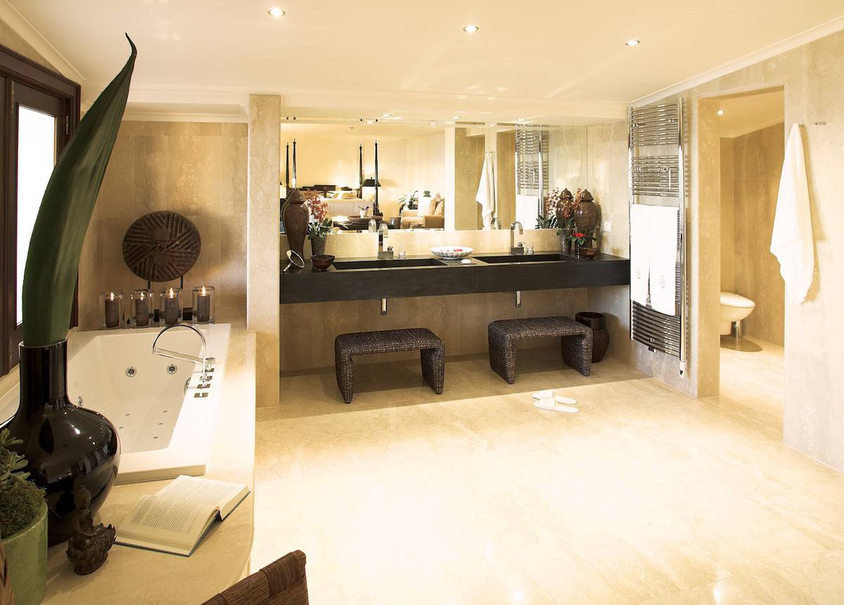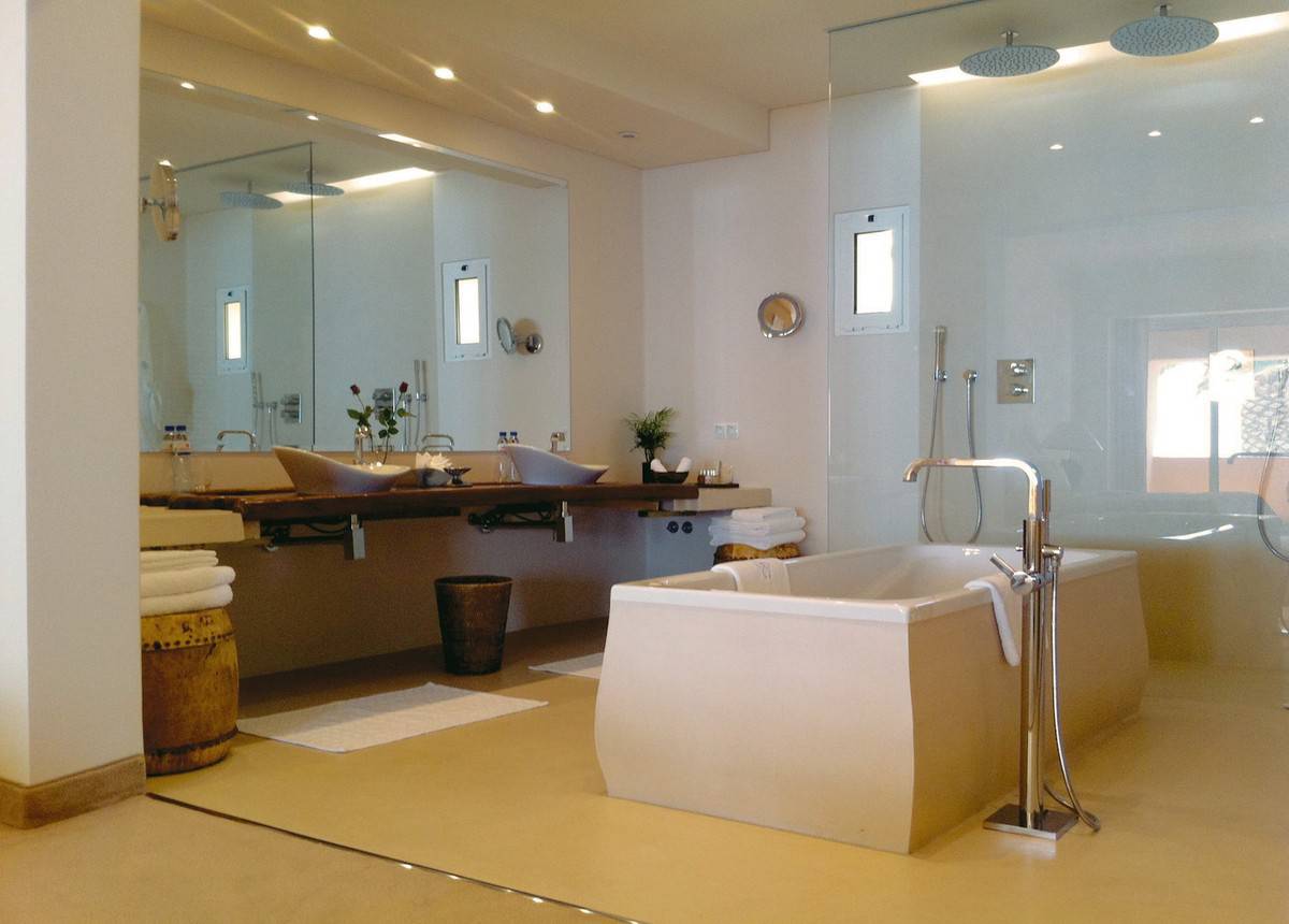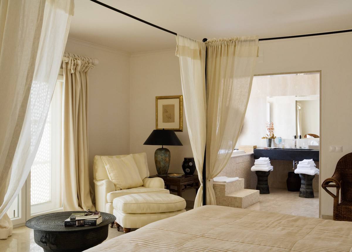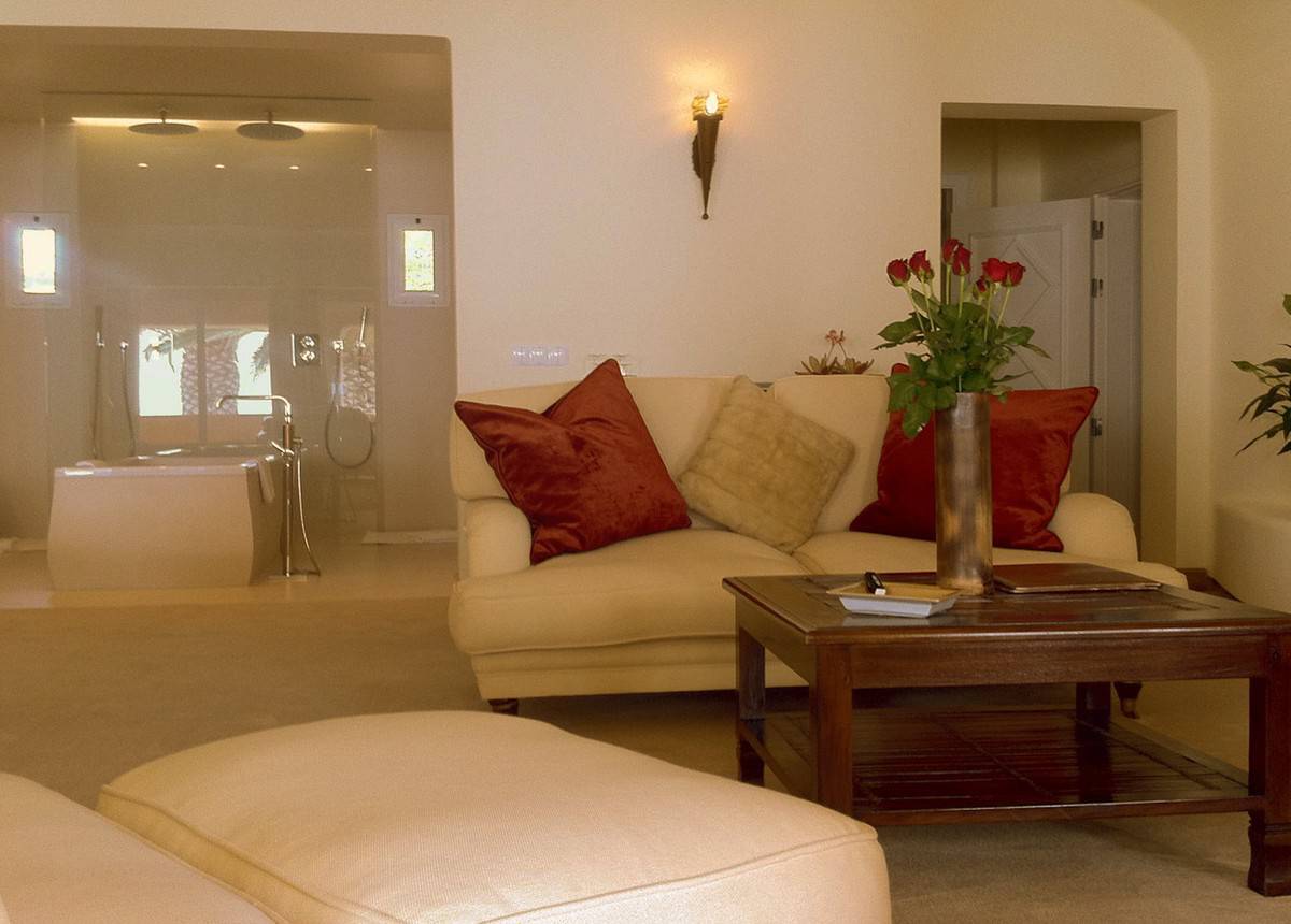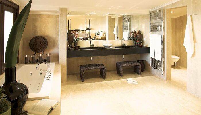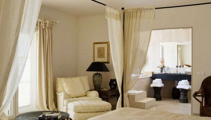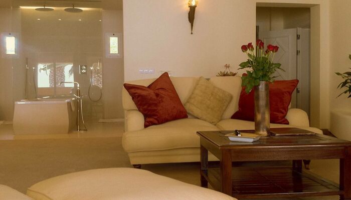 Royal Suite Alegria is a luxurious suite located on the ground floor with a private garden, private swimming pool and an outdoor shower. Inside you will find a large living room, dining area, spacious bedroom, deluxe bathroom with a free standing bath, a dressing room and separate guest toilet. Decorated with modern interior design in shades of white, beige and brown and contains antiques from around the world. Royal Suite Alegria also has breathtaking views of the Atlantic Ocean.